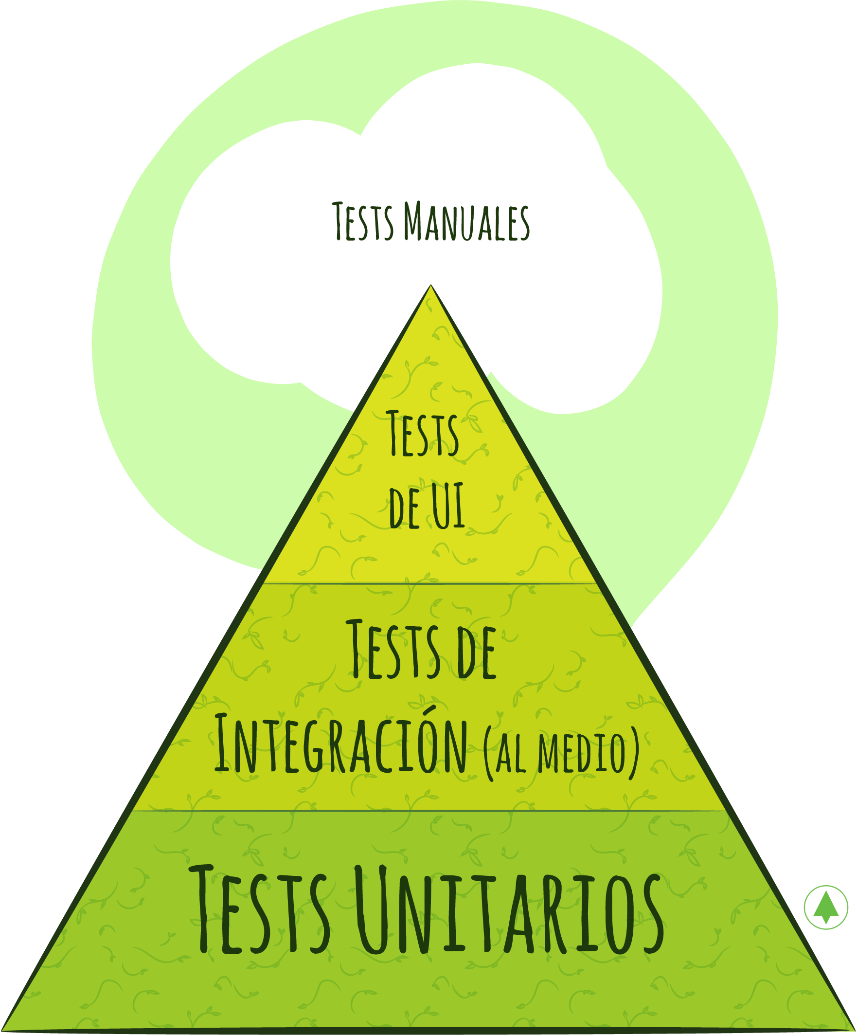 Pueden observar que la heurística sugiere que la proporción de tests unitarios sea la mayor, ya que son rápidos y robustos. Luego, siguen los tests de integración, que deben ser menos porque sólo deben testear que las integraciones entre los componentes ya testeados unitariamente funcionen. Finalmente, en la punta y con el área más pequeña vemos las tests de UI, cuya proporción es la menor: Son los más lentos, ya que debemos levantar todo el stack tecnológico para ejecutarlo y los menos robustos, pues se rompen con cambios en cualquiera de las capas. En mi experiencia, cuando se rompen, resulta difícil la detección del problema, pues son difíciles de debuggear y el logueo del error y de la ejecución son menos descriptivos.